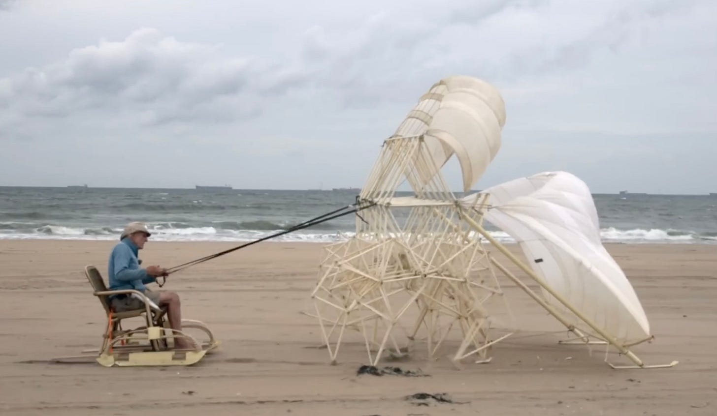 En dan Theo Jansen. Een man die al 35 jaar autonome strandbeesten bouwt uit PVC, creaturen die zich voortbewegen op wind en wonder. Terwijl de rest van de wereld robots tekent als metalen terminators, kiest Jansen voor poëzie. Zijn beesten rammelen, wiegen, stappen als een kruising tussen een mythologisch dier en een knutselproject van een briljante professor die te veel tijd op het strand doorbrengt.